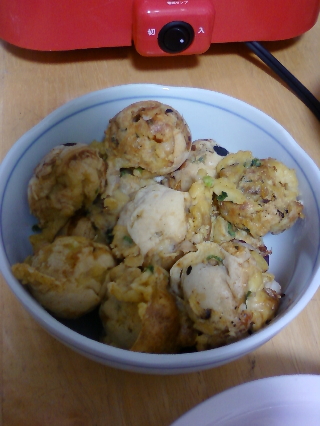 家で、タコ焼き器を買ったので、タコ焼きをしました。