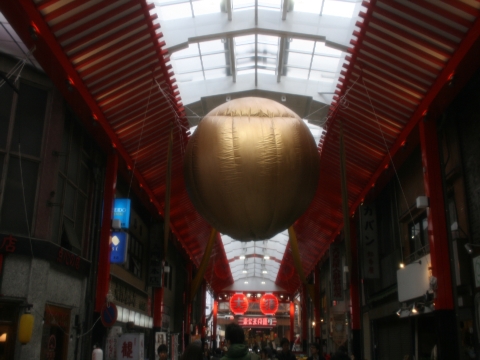商店街を歩いていると、金の玉が釣られていました。